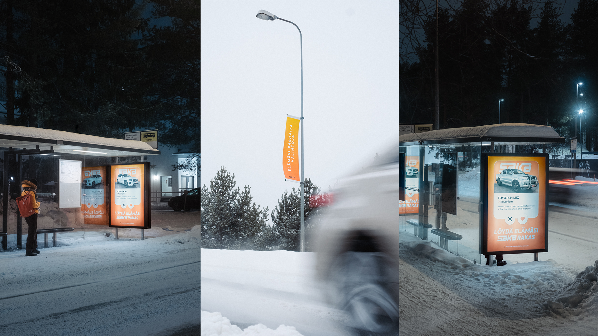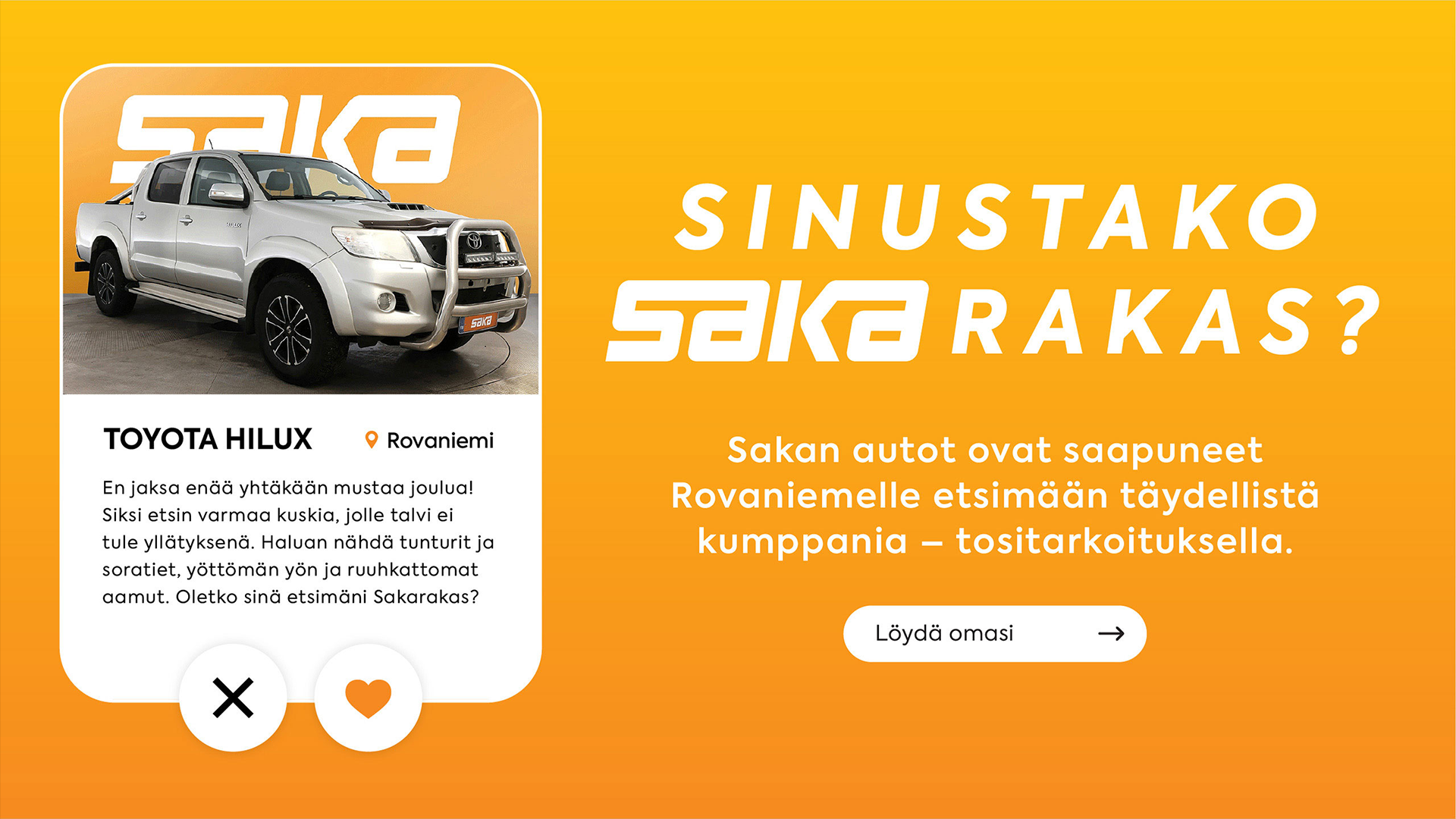 Therefore, we created a concept where used cars were coming to Lapland to find their perfect match: Sakarakas. A play on words and an endearing approach to something few people find very romantic, it unlocked fresh ideas and promised wide appeal.